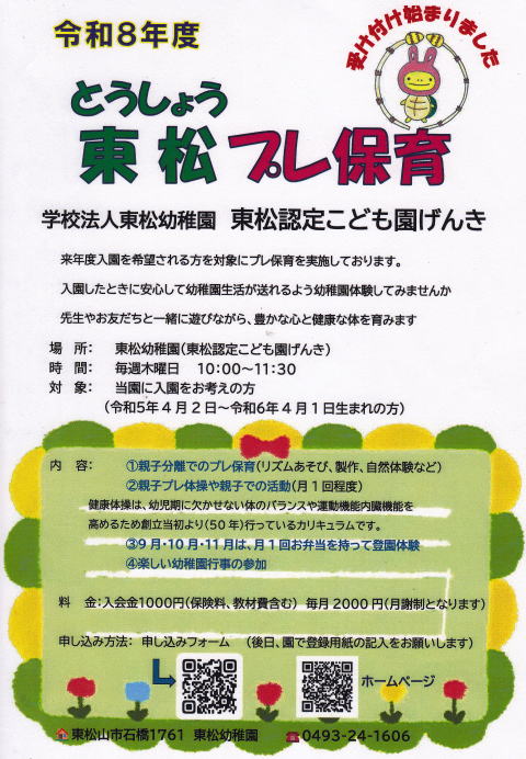 | 東松の保育は自然体験が盛りだくさん 健康体操 (11月20日) ![]() ![]() ![]() ![]() 遊びを通して学ぶ健康体操・楽しむ中で自然と身につく運動能力・ターザンロープ最高! 創立50周年記念イベント (11月14日) ![]() ![]() ![]() ![]() 県民の日に園児は元より卒業生(親)も来てくれました。太鼓、コーラス等など…専用Pへ 七五三詣り (11月13日) ![]() ![]() ![]() ![]() 「良い子になります様に!!」片道30分・大きい子と小さい子が手をつなぎ八幡神社へお詣り 『手作り』大看板 (11月7日) ![]() ![]() ![]() ![]() 180×270cmの大きな駐車場看板が出来ました 文字の切り抜き、忍者カットまで手作り 忍忍フェスティバル会 (10月24日) ![]() ![]() ![]() ![]() どこに出てくるかな?的入れ、お母さんと作ったカバン、何が釣れる?、輪投げも楽しい ![]() ![]() ![]() ![]() ポップコーン10円、さつまいもデザート50円、みんなと食べると美味しさ100倍 宿泊保育は、『天狗さがしの旅』『かっぱさがしの旅』『大冒険の旅』 をご覧下さい これより前は で見ることが出来ます |